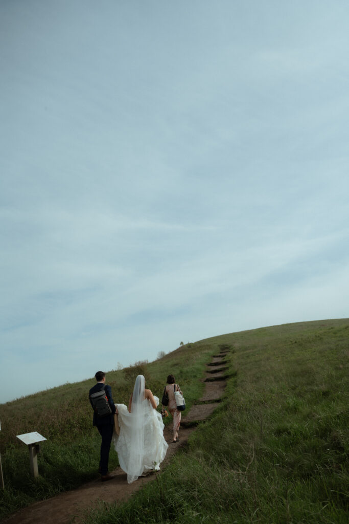 The loop trail to the summit is about 1.5 miles round-trip with a gradual but noticeable incline. It’s manageable in wedding attire as long as you’re wearing the right footwear, and most couples find it adds to the experience rather than detracting from it. (Also if you’re wondering what my bride in the above photos is wearing, its called a Bridal Buddy and it helps keep your dress off the ground and then she took it off once we got to the top! It made it so much easier to hike and we loved it!)